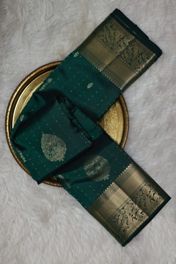 Ideal for weddings, festive celebrations, or cultural events, this saree exudes freshness and grandeur. The green base symbolizes growth and harmony, while the dynamic putta patterns and zari border reflect heritage craftsmanship. Style it with gold or kundan jewelry to amplify the zari’s brilliance, or opt for pearl and jade accessories to complement the organic tones for a balanced, sophisticated ensemble.
