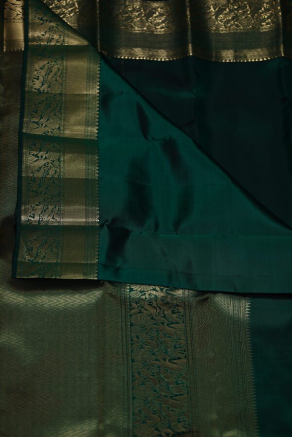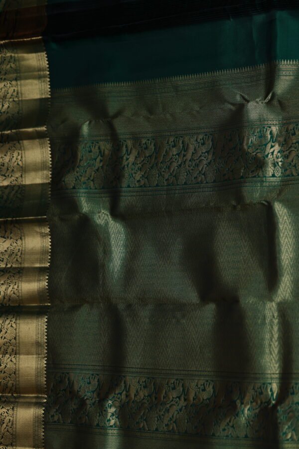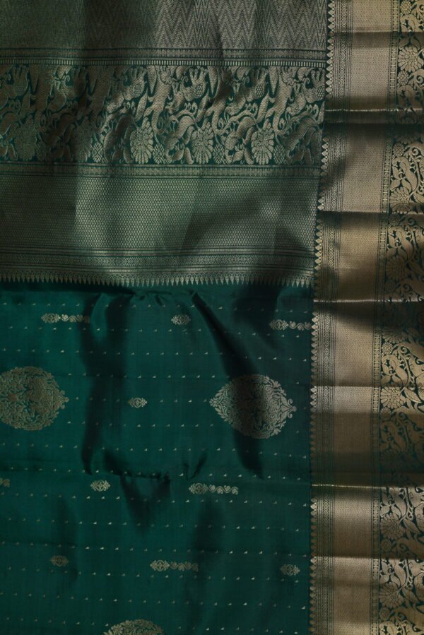 Embrace the rhythmic elegance of geometric artistry with our Emerald Harmony Kanchipuram Big Putta Small Putta Saree. This stunning piece features a lush green body adorned with a captivating interplay of big and small putta patterns, creating a textured visual rhythm that celebrates the precision of Kanchipuram weaving. The saree is elegantly framed by a border enriched with intricate zari work, where the gleaming gold threads highlight the seamless transition from body to border, adding a touch of traditional opulence to the vibrant base.