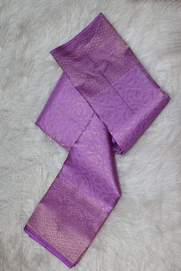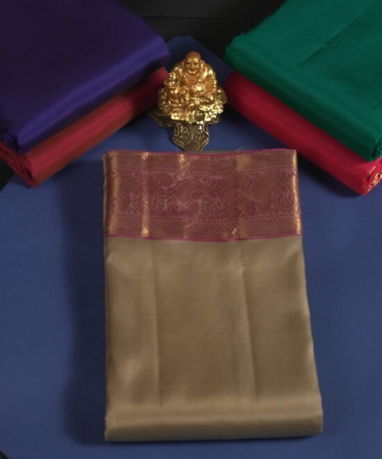 Embrace the delicate charm of nature-inspired artistry with our Pink Prosperity Kanchipuram Broket Saree. This exquisite piece features a soft pink body adorned with a mini money plant-like pattern, where the trailing vines and heart-shaped leaves are meticulously woven using the Broket technique to create a raised, textured effect. The border is elegantly designed with complementary motifs, enhanced by subtle zari work that frames the saree with understated opulence, celebrating the harmony between organic beauty and traditional craftsmanship.