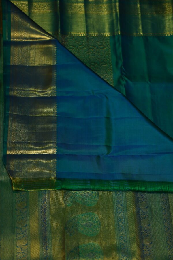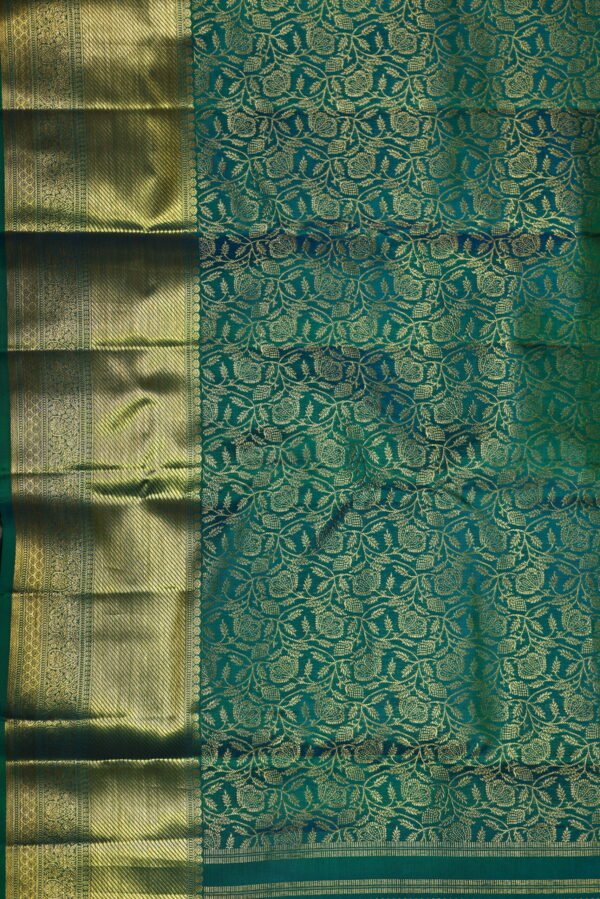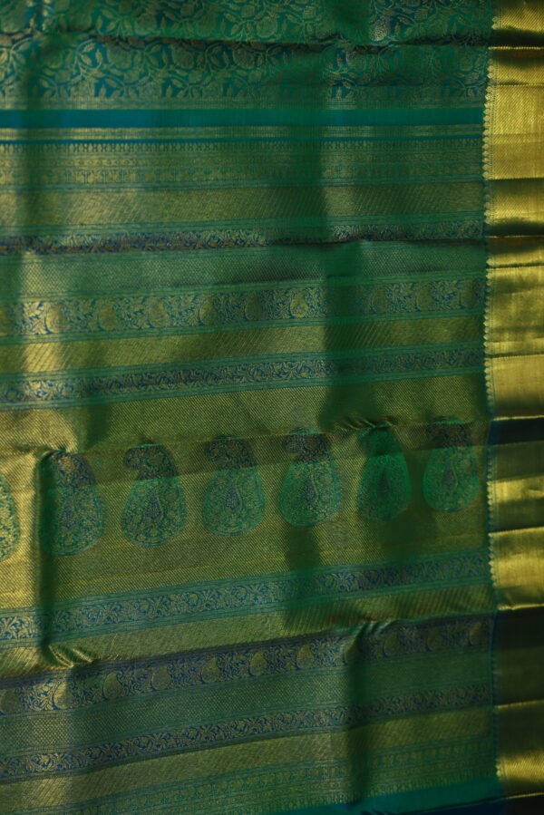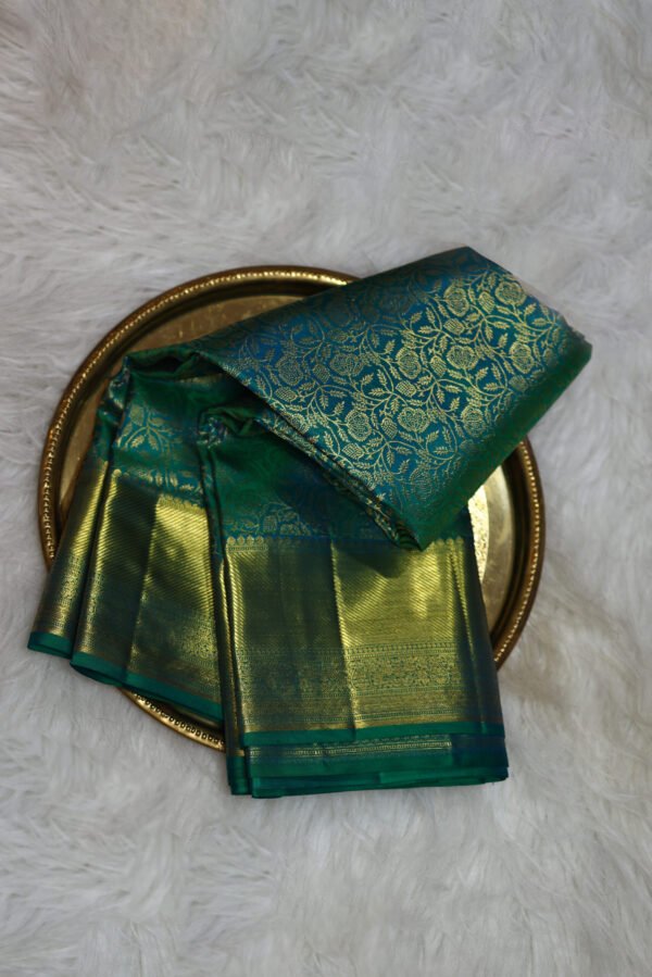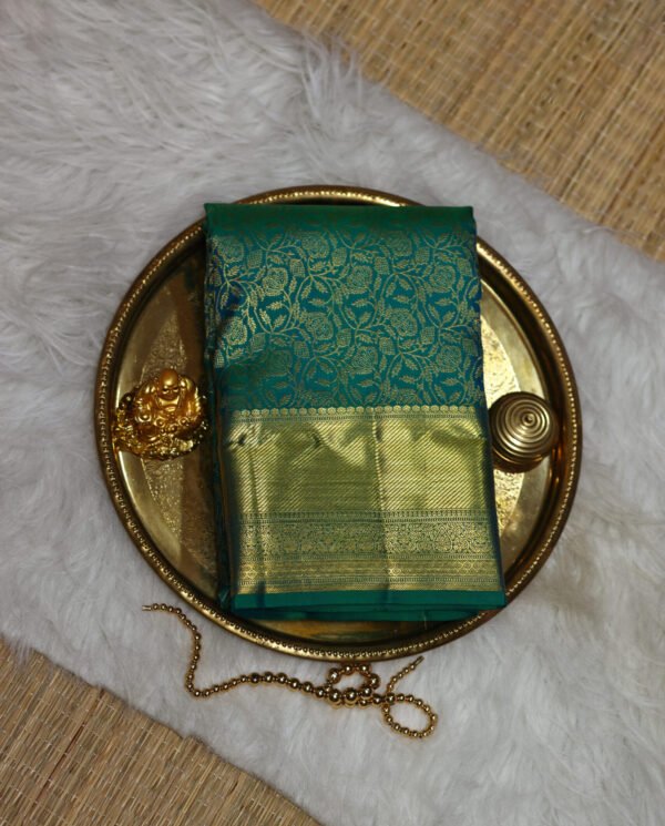 Ideal for grand weddings, festive celebrations, or cultural ceremonies, this saree embodies renewal and regal charm. The green base symbolizes growth, harmony, and prosperity, while the jacquard patterns and zari border reflect masterful craftsmanship. Style it with kundan or gold jewelry to amplify its brilliance, or opt for pearl and jade accessories for a balanced, nature-inspired ensemble.
