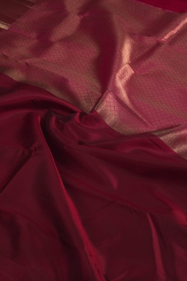 Embrace the lush elegance of nature’s bounty with our Vineyard Majesty Kanchipuram Plain Big Border Saree. This regal piece features a rich deep wine red body adorned with a bold, wide border intricately detailed with large gold motifs, elegantly complemented by a vibrant leaf green accent along the edge. Woven with pure mulberry silk and crafted using the revered korvai technique, this saree showcases the iconic Kanchipuram artistry, where the expansive border becomes the centerpiece of its opulent design. The harmonious fusion of deep wine red, fresh leaf green, and radiant gold creates a captivating blend of organic vitality and royal grandeur.