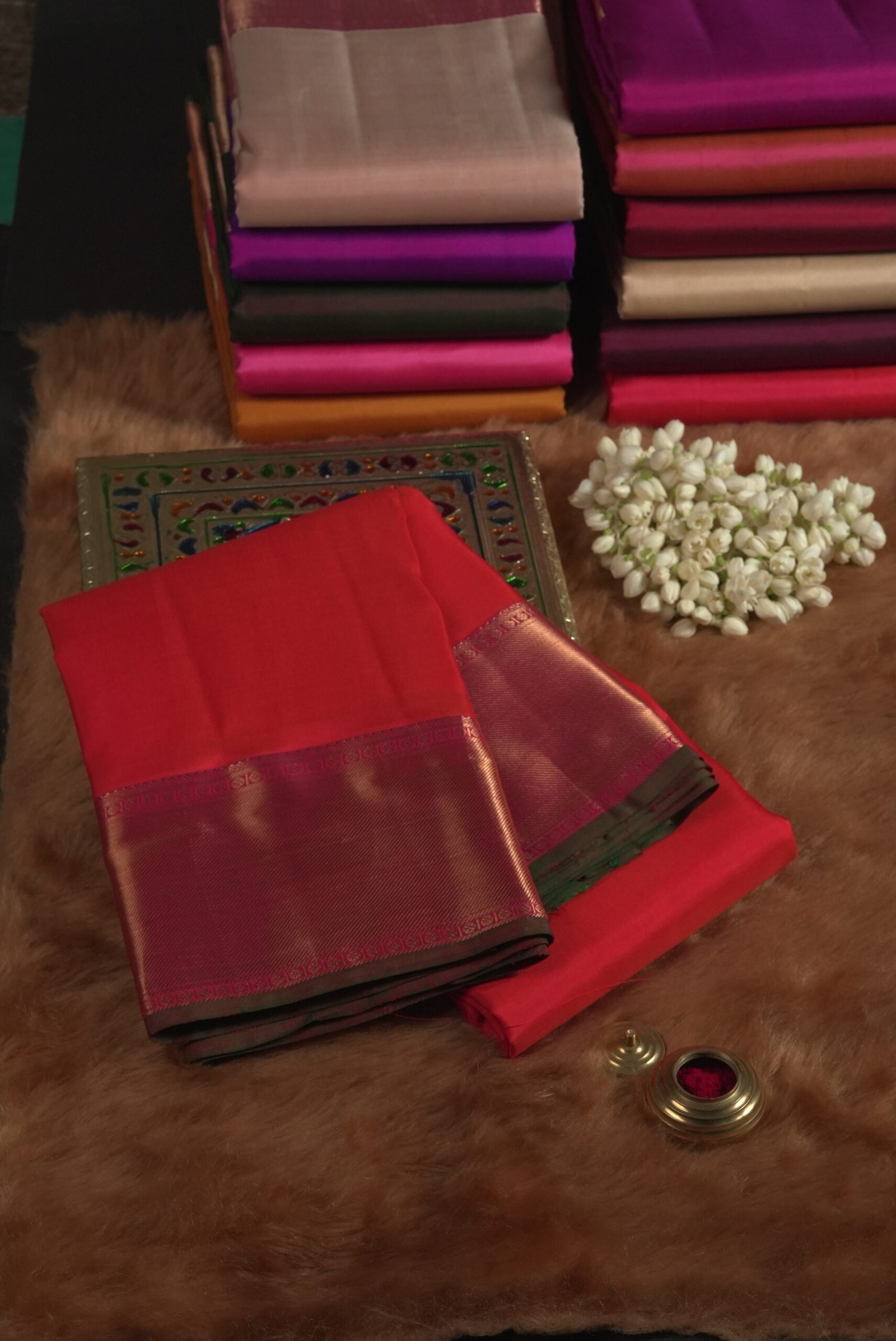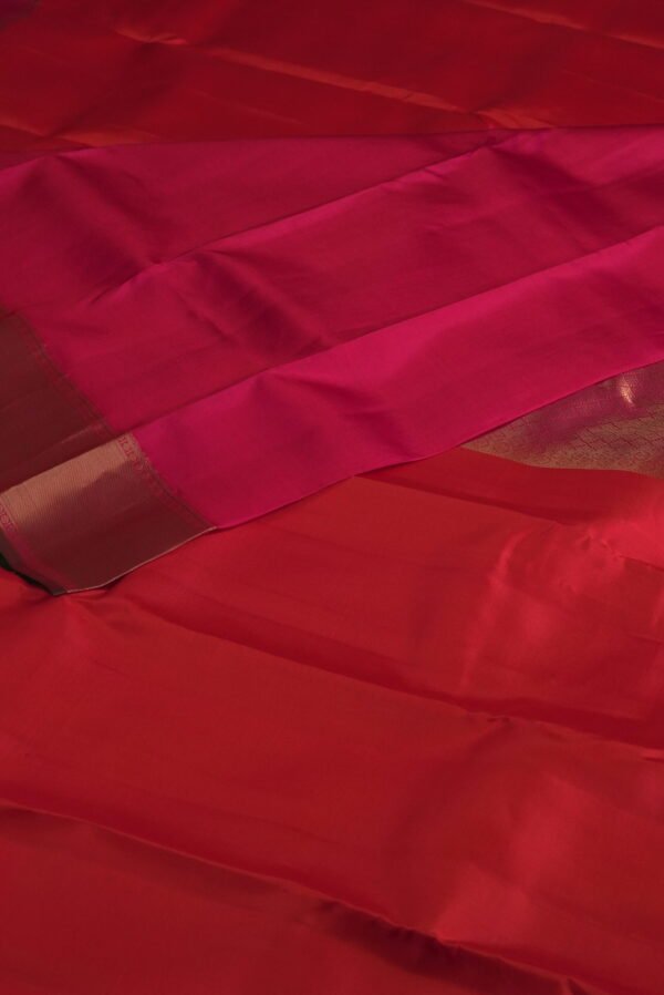 Embrace the vibrant fusion of bold elegance and traditional grandeur with our Blossom Gold Kanchipuram Plain Big Border Saree. This striking piece features a luminous deep bright pink body adorned with a bold, wide border intricately detailed with large gold motifs, elegantly complemented by a rich brown accent along the edge. Woven with pure mulberry silk and crafted using the revered korvai technique, this saree showcases the iconic Kanchipuram artistry, where the expansive border becomes the centerpiece of its opulent design. The harmonious contrast of vibrant pink, earthy brown, and shimmering gold creates a captivating blend of modern energy and timeless sophistication.