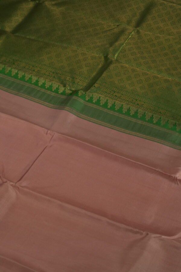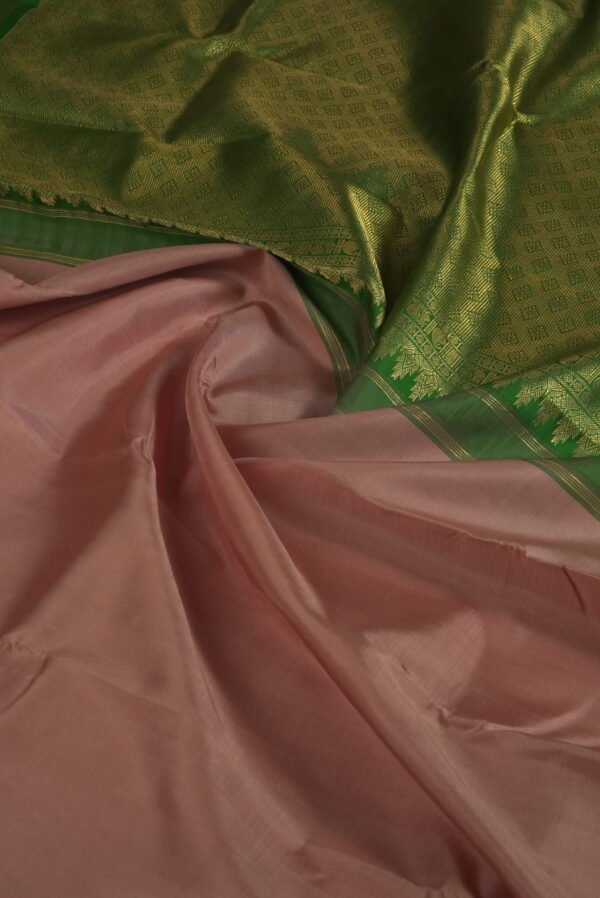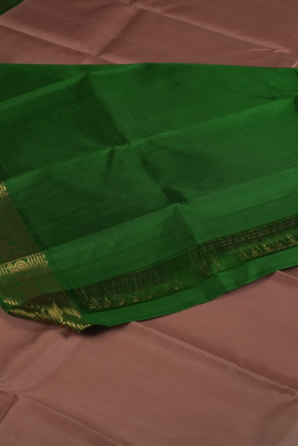 Embrace the warm, rustic elegance of nature’s palette with our Copper Grove Kanchipuram Plain Border Saree, a distinguished piece from our Kanchipuram Plain Border collection. This exquisite saree features a rich earthy copper brown body adorned with a plain border intricately detailed with gold motifs and accented by a soothing green hue along the edge. Woven with pure mulberry silk and crafted using the revered korvai technique, the saree embodies the timeless artistry of Kanchipuram weaving, where understated grace meets regal opulence. The harmonious blend of earthy tones and metallic brilliance creates a captivating balance of warmth and sophistication.