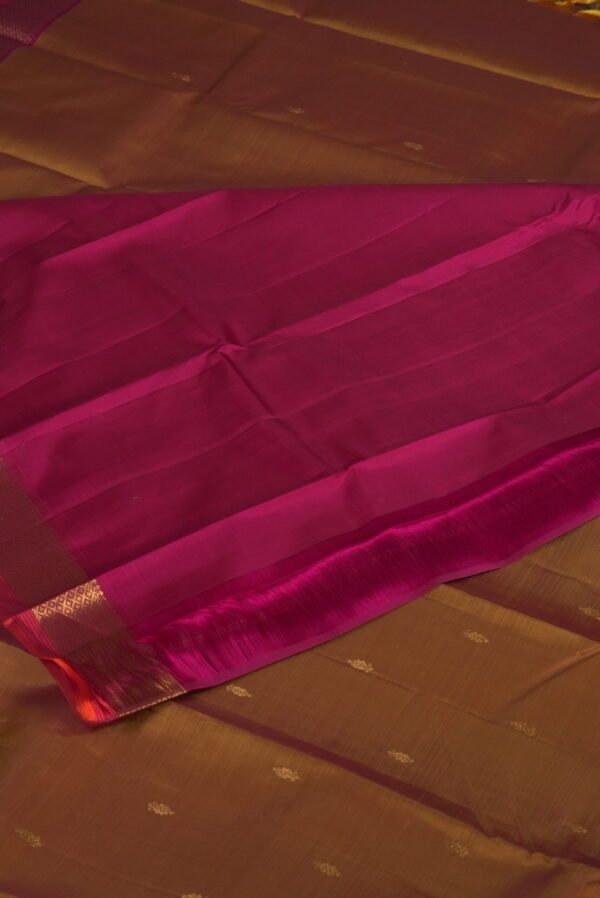 Embrace the vibrant energy of a tropical sunset with our Sunset Blossom Kanchipuram Putta Saree, a radiant piece from our Kanchipuram Putta Saree Small Border collection. This exquisite saree features a warm yellowish-orange body adorned with a lively bright pink border intricately detailed with small gold putta motifs. Woven with pure mulberry silk and crafted using the revered korvai technique, the saree showcases the iconic putta (small checks) pattern, symbolizing heritage and artistry. The bold, cheerful color palette creates a stunning fusion of energy and elegance, perfect for making a memorable statement.