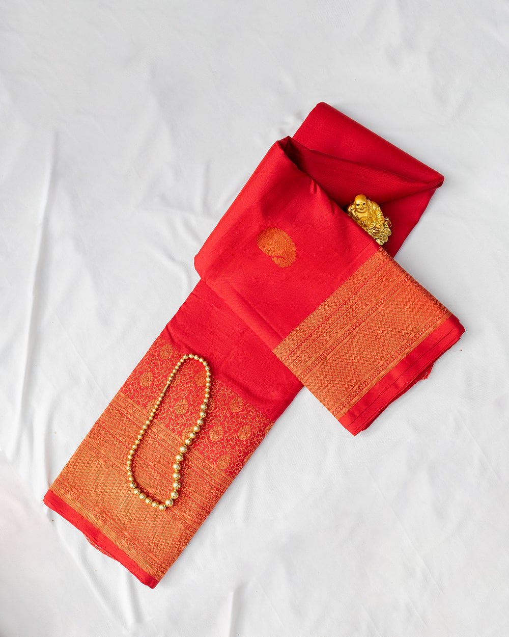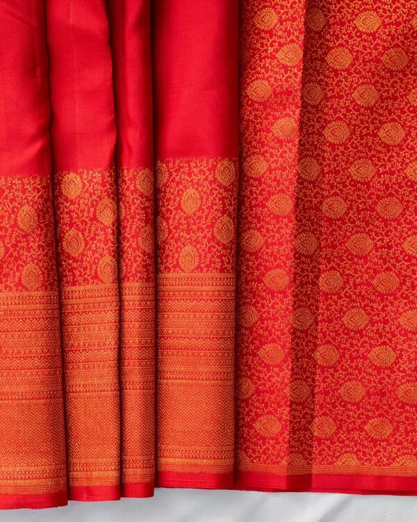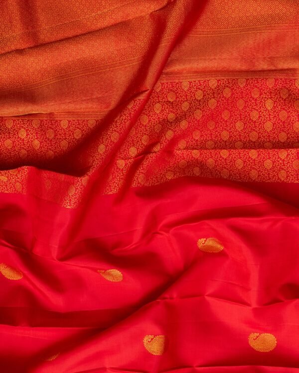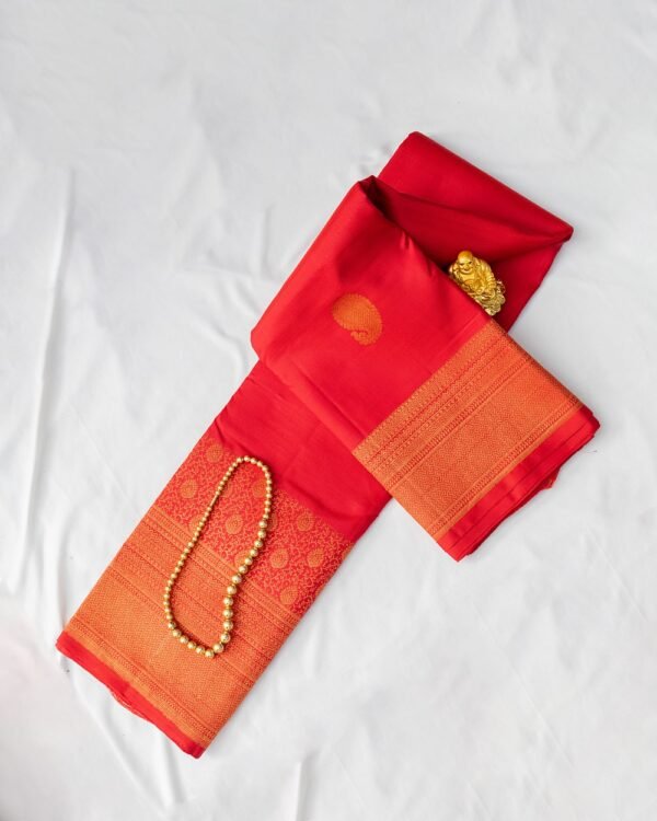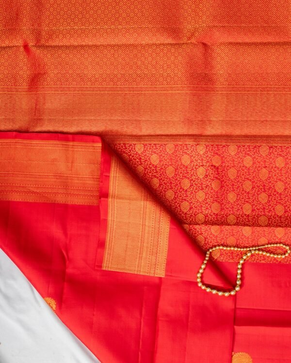 “Celebrate tradition with this exquisite Kanchipuram saree from Muthu Handloom Weavers. The body of the saree is beautifully decorated with mango puttas, meticulously woven using copper zari, adding a rich and vibrant look to the fabric. The turning border is designed with delicate floral and zigzag patterns in copper zari, enhancing the saree’s overall appeal with a touch of elegance.