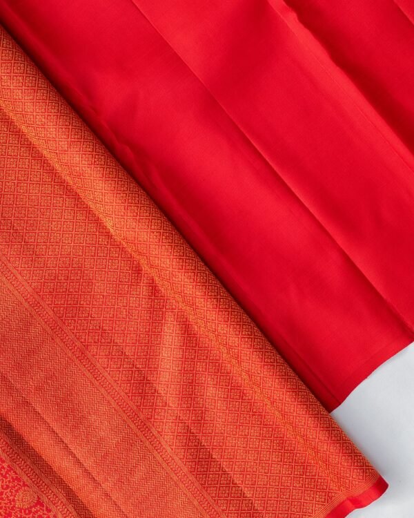 The pallu features intricate floral motifs along with a diamond cut design, combining to create a classic and timeless look that radiates tradition. The geometric and floral designs add depth and sophistication to the saree, making it a perfect choice for weddings and cultural events.