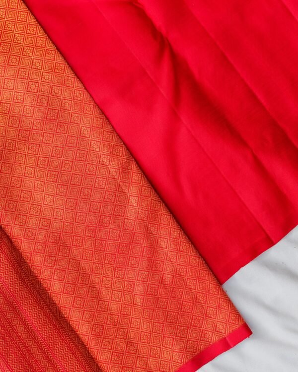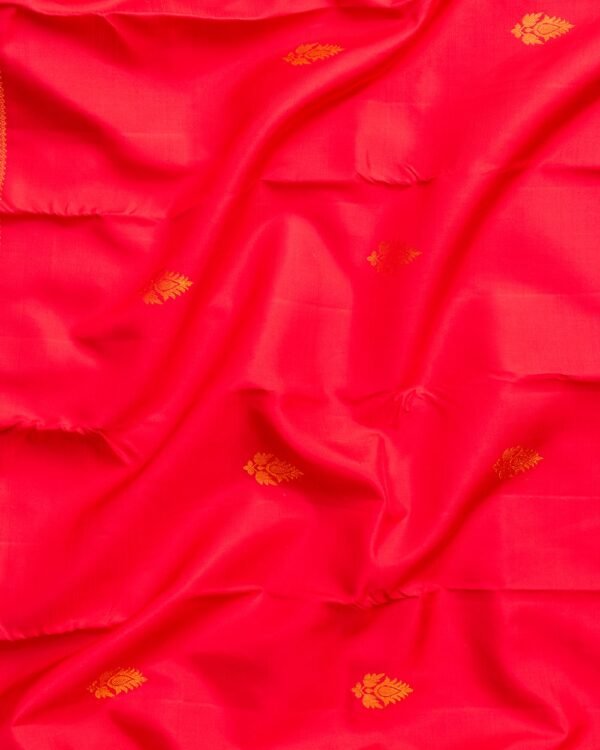 The saree is framed by double borders—9 inches and 4 inches—woven with a striking Banaras zigzag pattern that mimics a turning border, adding a unique and graceful touch to the saree’s overall look. The pallu is adorned with traditional Banaras design, further accentuating the saree’s grandeur.