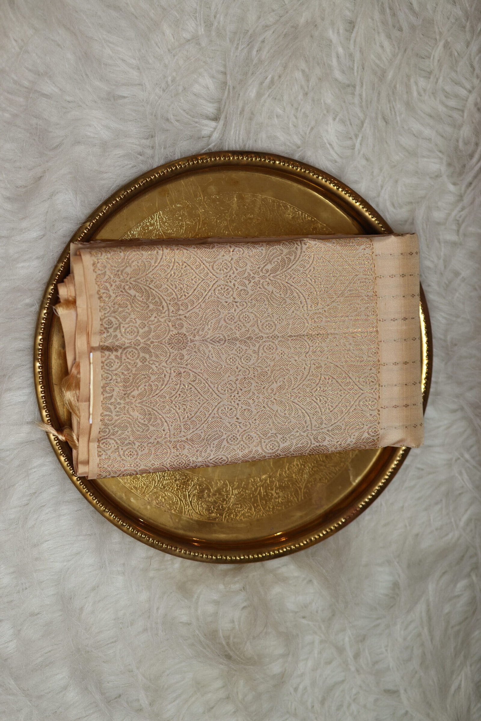 Embrace the delicate allure of heritage and sustainability with our Eternal Grace Kanchipuram Turning Border Neem Zari Saree. This elegant piece features a refined body crafted from pure mulberry silk, adorned with a graceful turning border intricately woven using neem zari—an eco-friendly alternative that retains the gleam and grandeur of traditional zari while being gentle on the skin and the environment. The turning border design ensures the border motif flows seamlessly along the saree’s edge, creating a continuous, harmonious look that embodies sophistication.