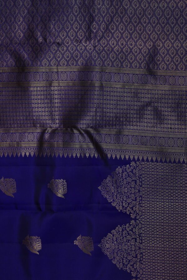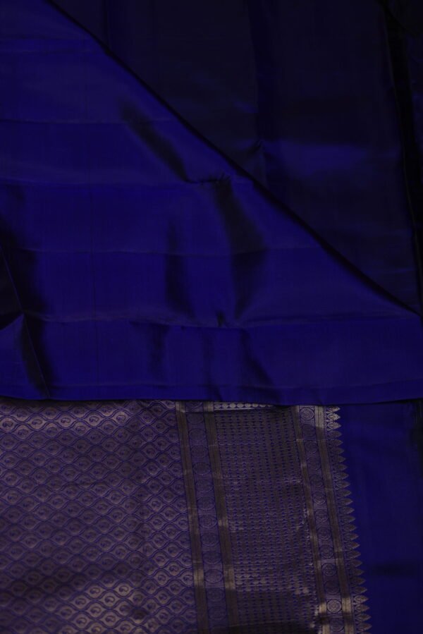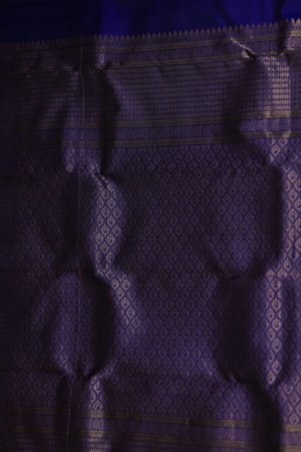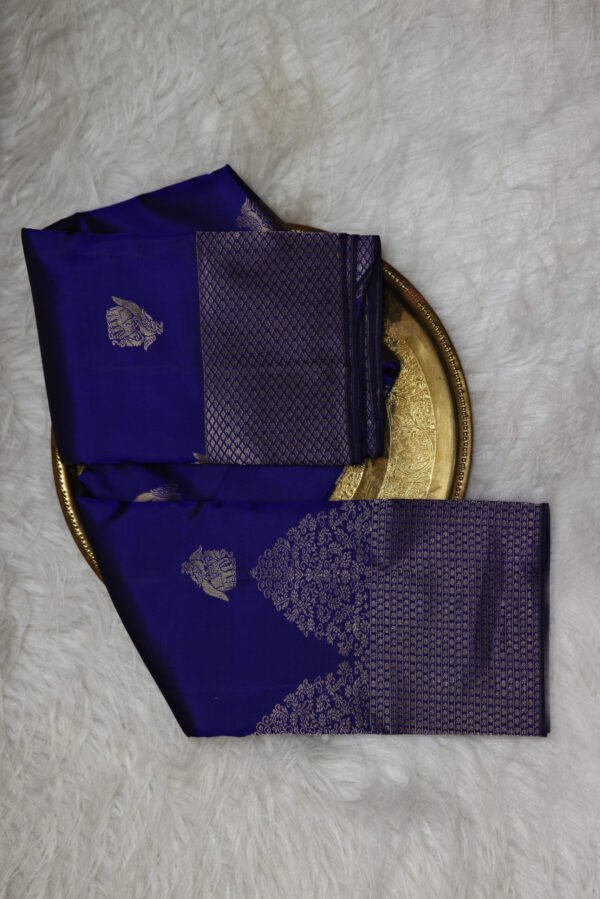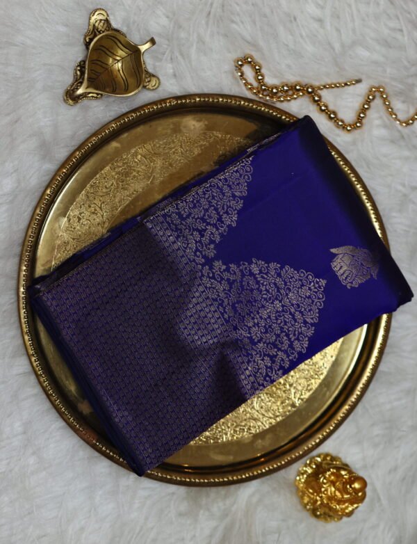Ideal for weddings, festive gatherings, or formal events, this saree exudes sophistication and heritage charm. The dark blue base symbolizes depth and stability, while the putta pattern reflects the precision of Kanchipuram craftsmanship. Style it with silver or diamond jewelry to complement the cool tones, or opt for traditional gold accessories to add warmth and grandeur for a balanced, elegant ensemble.