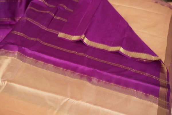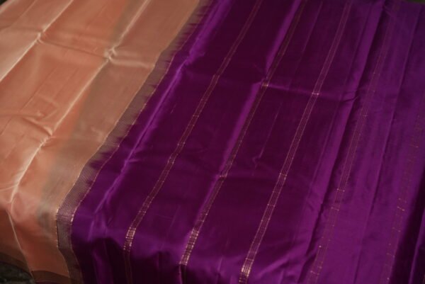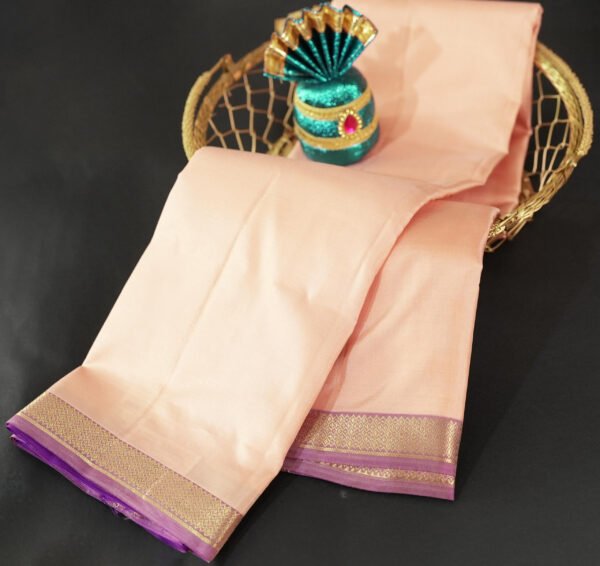 Perfect for daytime weddings, festive gatherings, or formal occasions, this saree strikes a harmonious balance between simplicity and refinement. The warm peach base evokes grace and femininity, while the gold motifs and lavender border introduce a hint of regal charm. Style it with pearl or gold jewelry to enhance its delicate allure, or opt for minimalist accessories to let the saree’s subtle elegance shine.